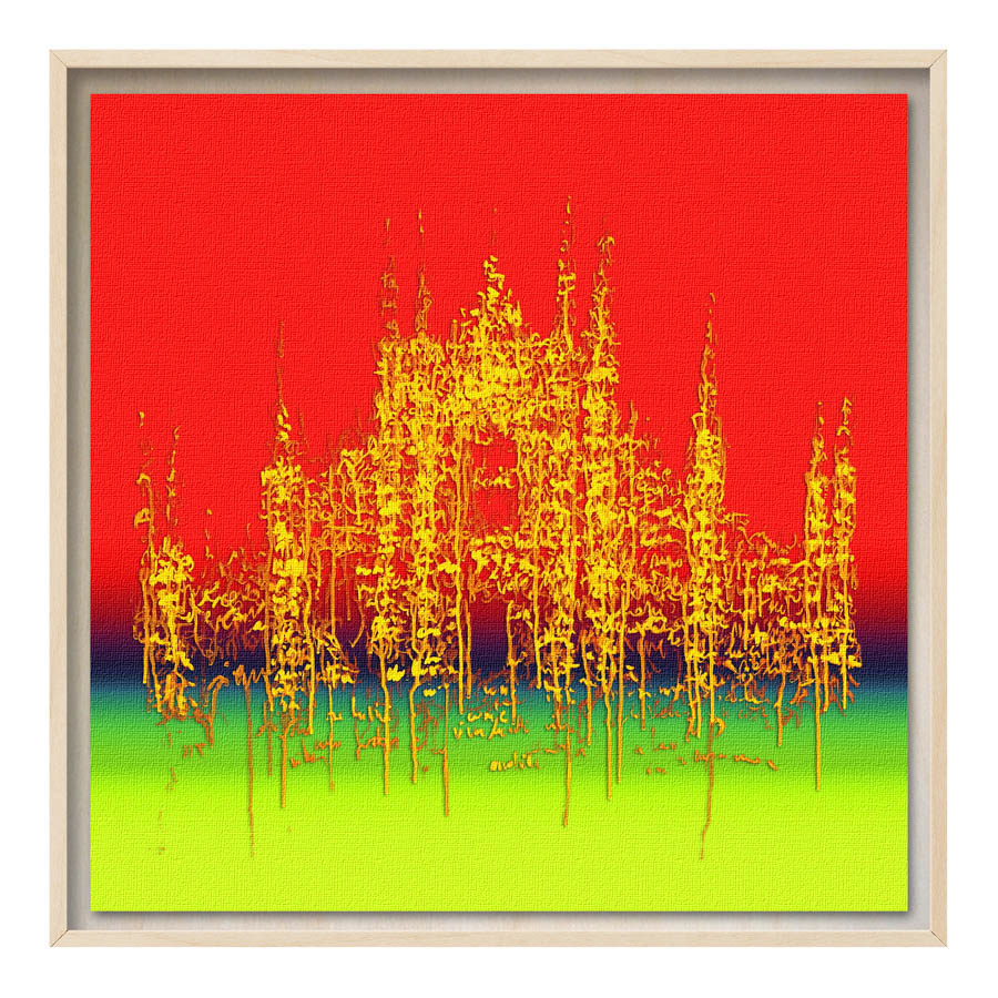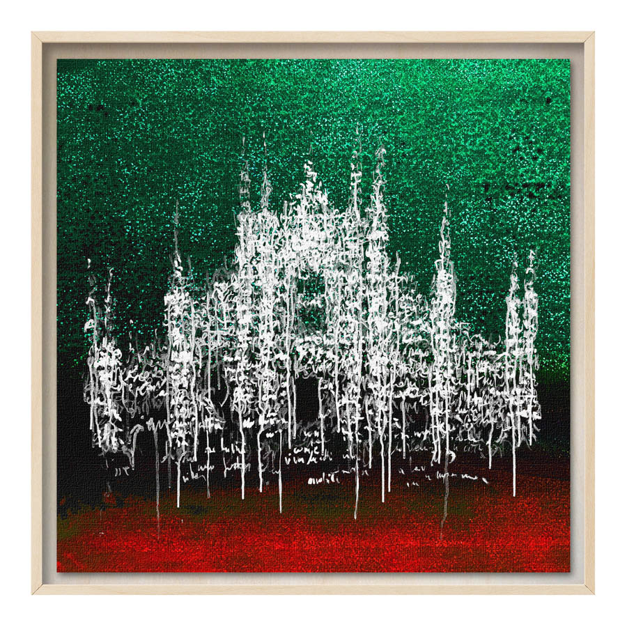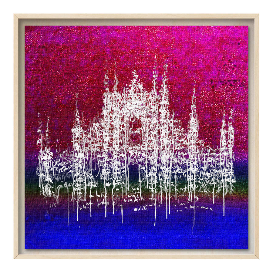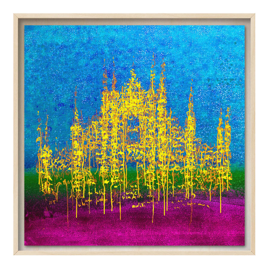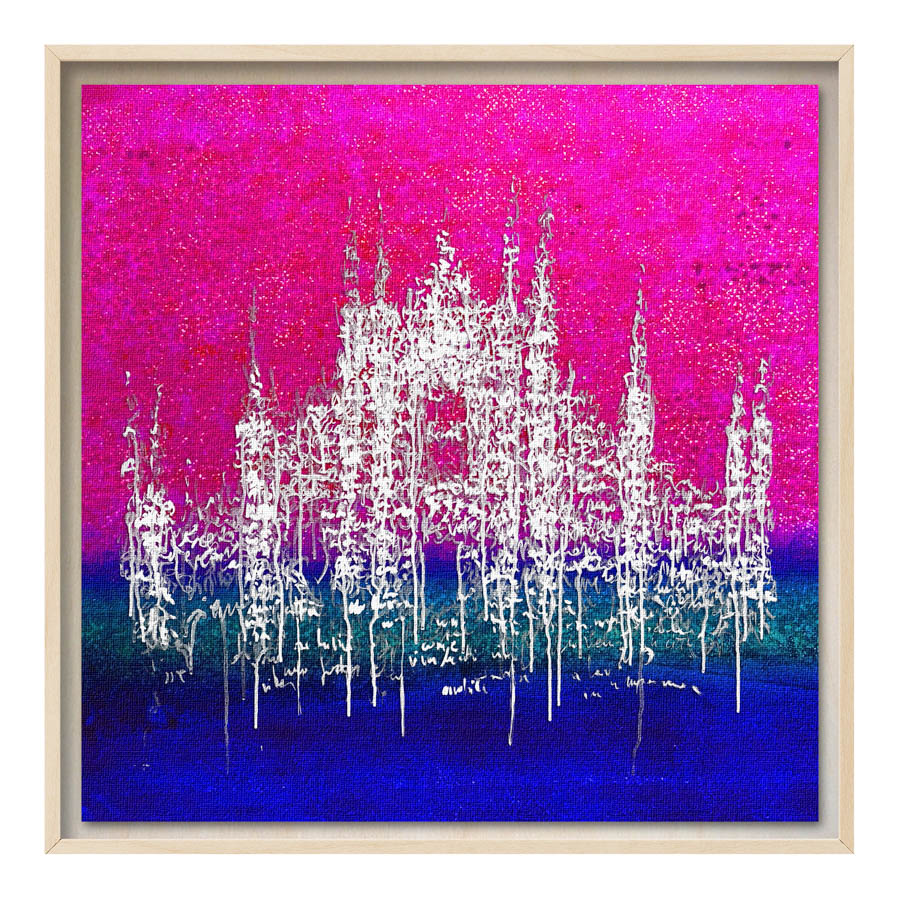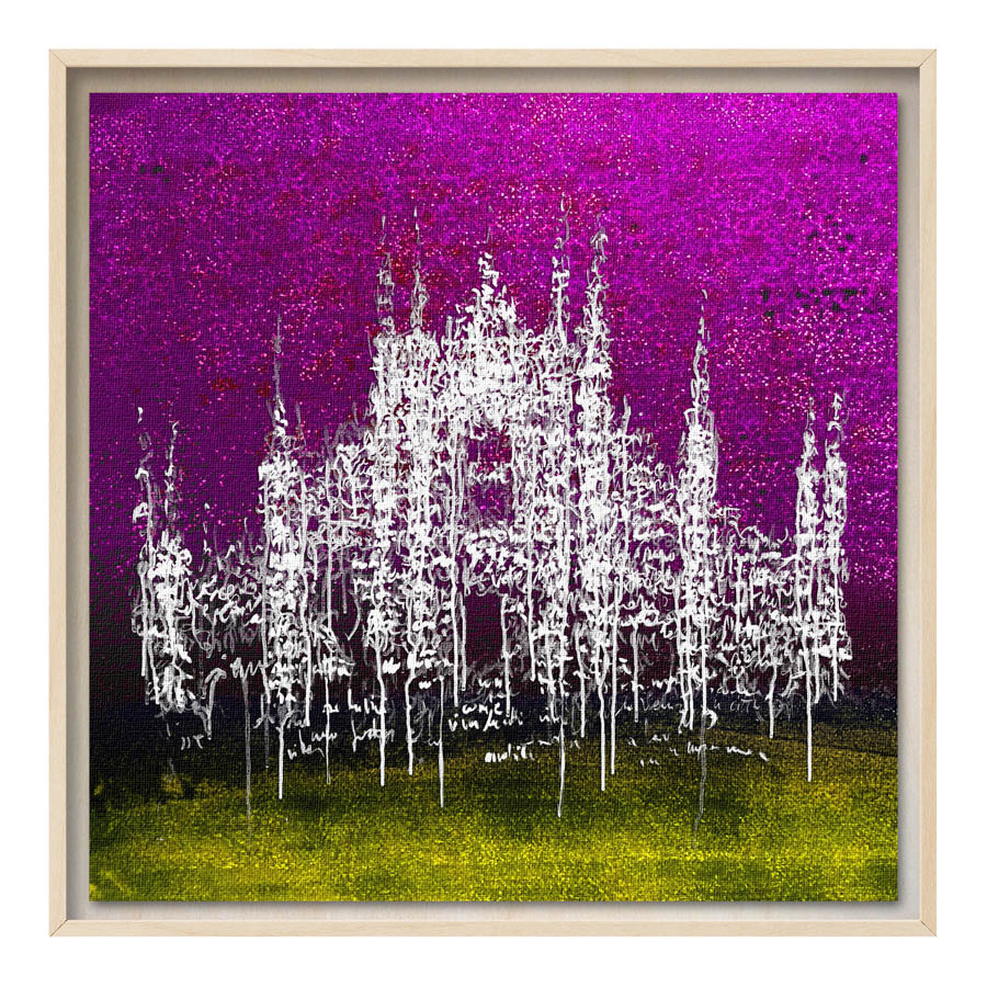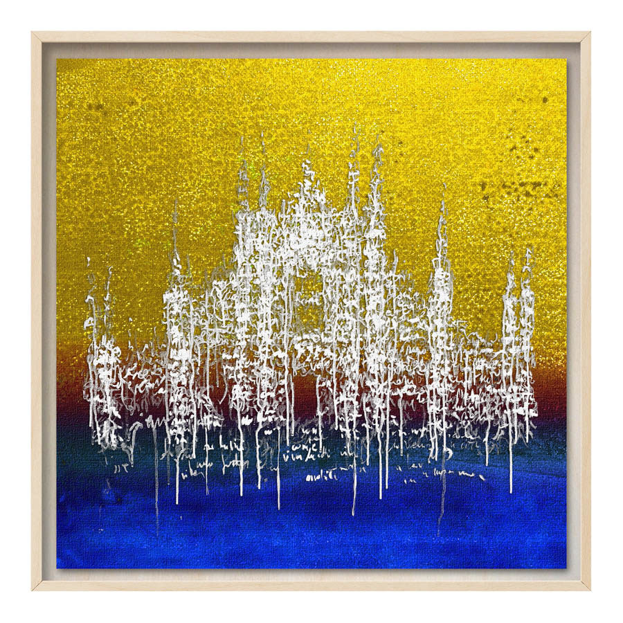Queste opere sono realizzate con tecnica mista, stampa su tela di altissima qualità, durevole e resistente alla luce (il colore non subirà cambiamenti negli anni), con interventi pittorici che creano di ogni opera un pezzo unico numerato, con una tiratura di 100 copie. Le misure sono 28×28 cm con cornice “tedesca” in legno naturale.