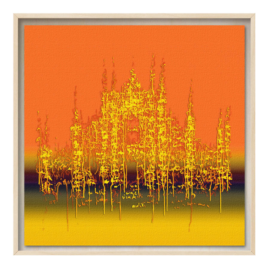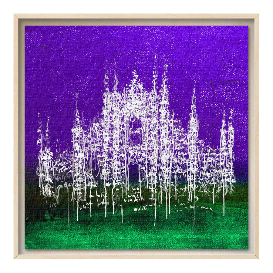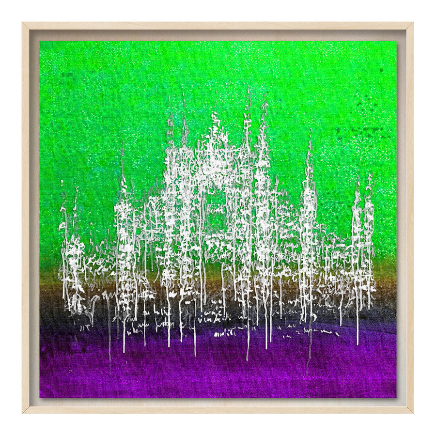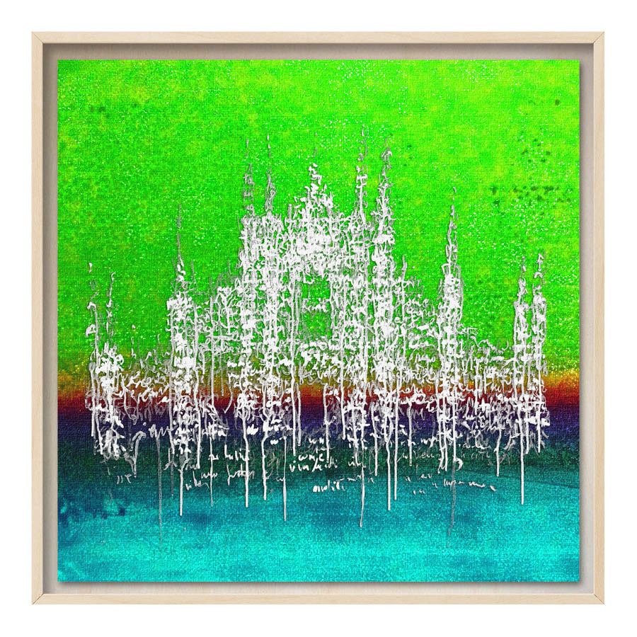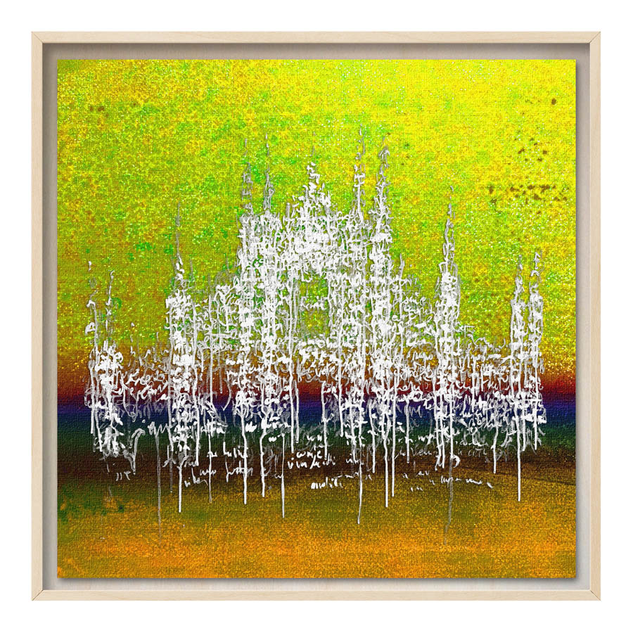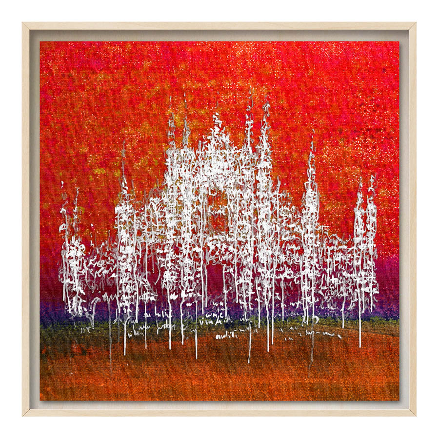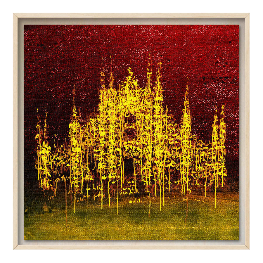 Queste opere sono realizzate con tecnica mista, stampa su tela di altissima qualità, durevole e resistente alla luce (il colore non subirà cambiamenti negli anni), con interventi pittorici che creano di ogni opera un pezzo unico numerato, con una tiratura di 100 copie. Le misure sono 28×28 cm con cornice “tedesca” in legno naturale.