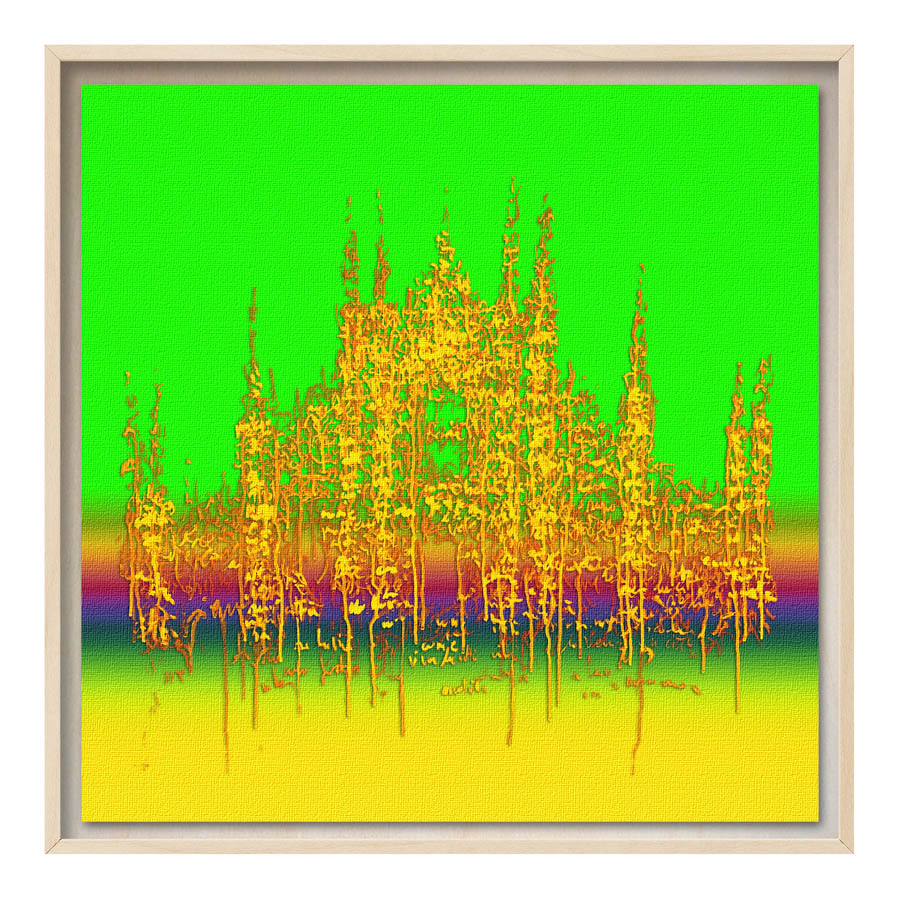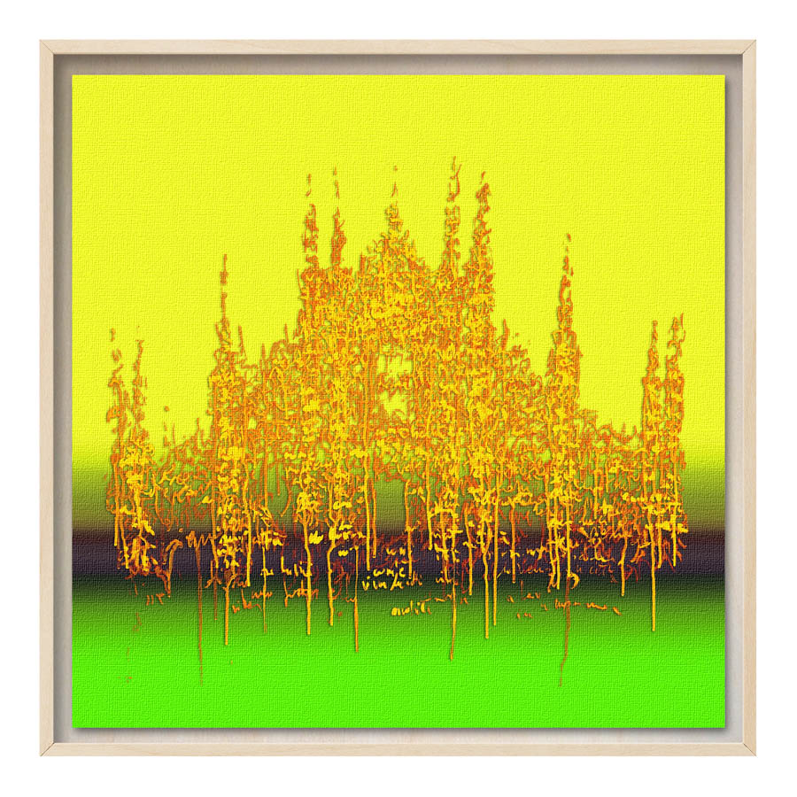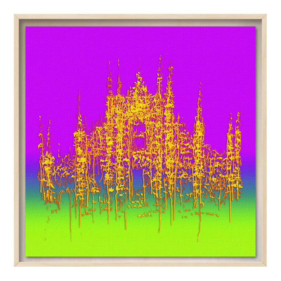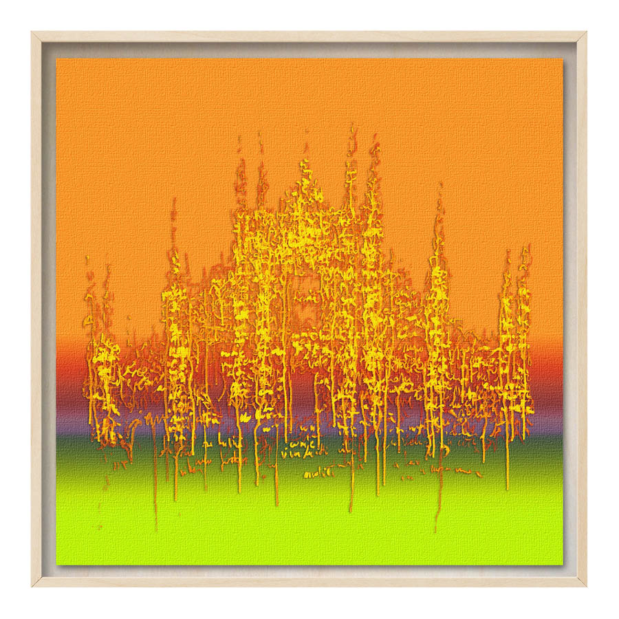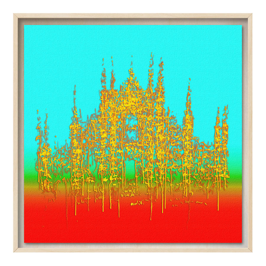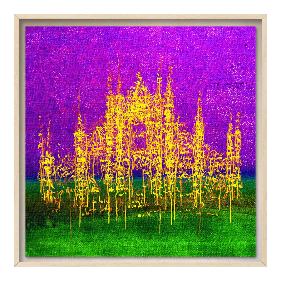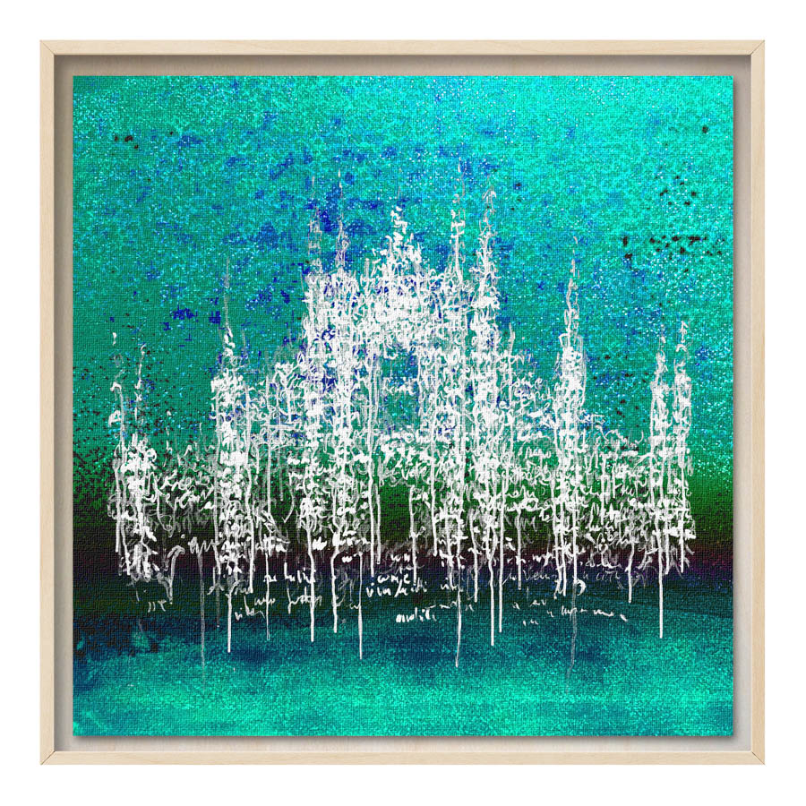 Queste opere sono realizzate con tecnica mista, stampa su tela di altissima qualità, durevole e resistente alla luce (il colore non subirà cambiamenti negli anni), con interventi pittorici che creano di ogni opera un pezzo unico numerato, con una tiratura di 100 copie. Le misure sono 28×28 cm con cornice “tedesca” in legno naturale.